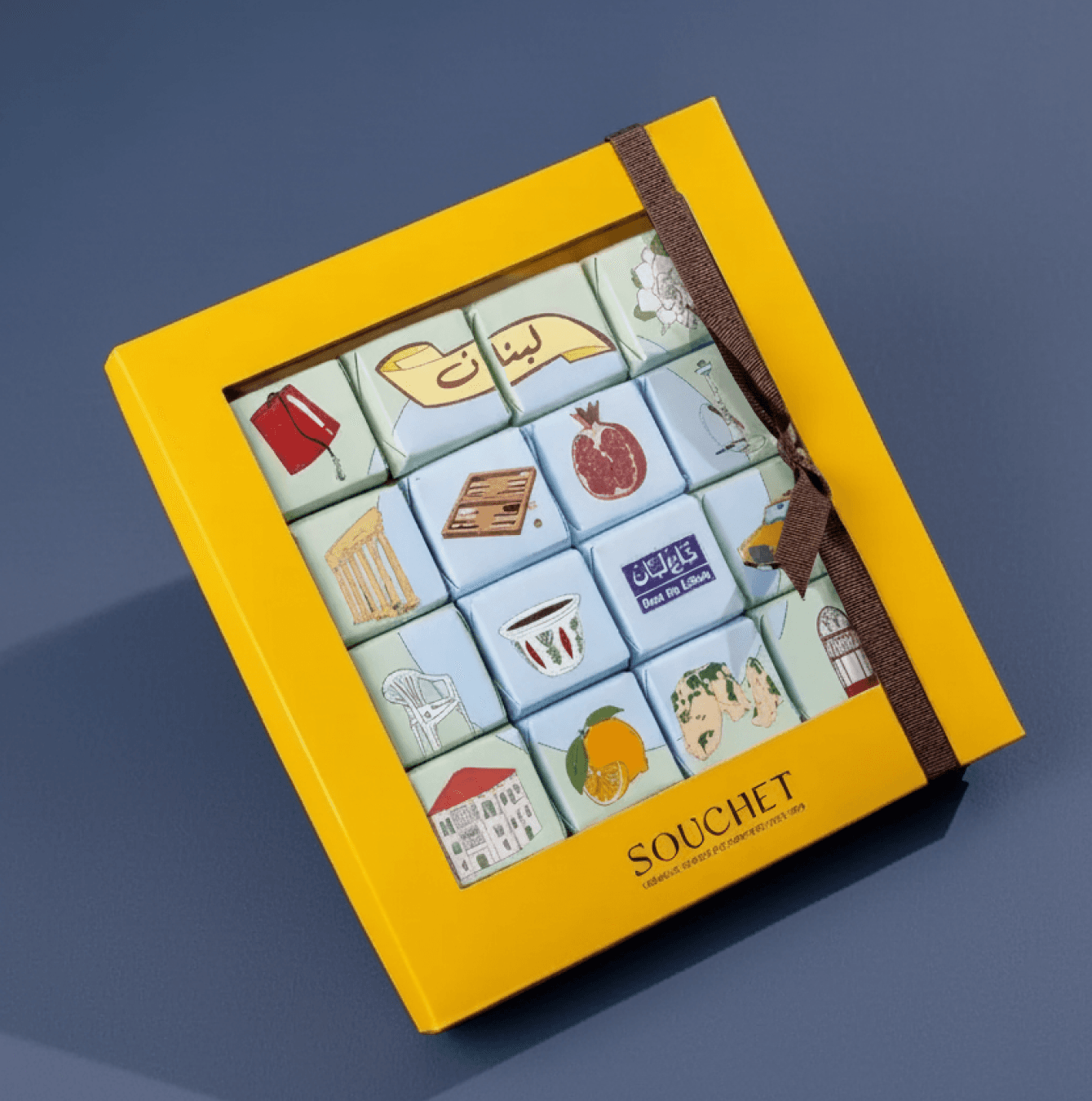 to create a distinctive gifting experience, Gioca Studio developed two custom boxes that elevate Souchet’s chocolates beyond confectionery into objects meant to be kept and shared. The windowed structure reveals a grid of individually wrapped pieces, each featuring hand-drawn illustrations inspired by everyday Lebanese life — architecture, food, objects, and cultural details — turning every chocolate into a small, collectible moment.